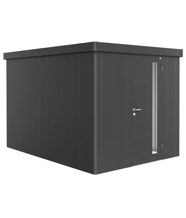 Das Biohort Gerätehaus Neo 4B bietet Ihren Gartengeräten einen festen, aber auch einen sicheren „Wohnsitzˮ! Das beginnt mit der doppelten Materialstärke der Stahlblechpaneele, führt über das bis 150 kg/m² Schneelast tragende Flachdach mit Wasserableitsystem und endet mit der gasdruckgefederten Tür mit Zylinderschloss und 3-fach-Verriegelung. Das Gerätehaus trotzt mit seiner stabilen Konstruktion Stürmen bis Windstärke 12, ist regendicht und dank seiner feuerverzinkten, polyamid-einbrennlackierten Paneele gegen alle Witterungen gefeit. Die offene Holzdecke im Inneren regelt die Luftfeuchtigkeit.