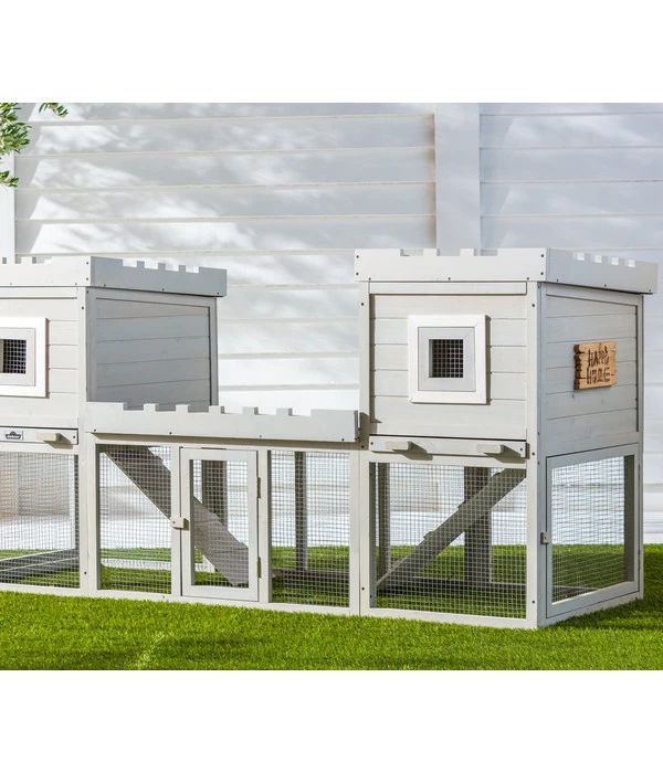 Wenn es um Ihre Zwergkaninchen geht, muss der Stall mehr als stabil und artgerecht konstruiert sein. Ihr Zuhause sollte nach Ihrem Geschmack schon auch etwas fürs Auge bieten. Deshalb sind Sie bei Ihrer Suche zielsicher beim Dehner Nagerheim Happy Home Nottingham gelandet. Dieser interessante Kaninchenstall wurde mit viel Liebe zum Detail in der Optik einer zweitürmigen Burg gestaltet. Das zeigen die stilechten Zinnen der Türme und am Gehegedach, perfekt abgerundet durch den grauen Anstrich. Für Ihre Kaninchen ist jedoch das Innenleben Ihrer neuen Burganlage wichtig. Sie werden es genießen, sich in den Kuschelhöhlen der beiden Türme zu verstecken, aneinander gekuschelt zu dösen oder versonnen an einem Heuhalm zu knabbern. Aber dann geht es wieder hinunter ins Freigehege. Dort wird getobt, geflitzt und wieder über die Leitern in die Turmzimmer geklettert. Sie werden schnell erkennen, welche Lebensfreude Ihre Fellnasen in ihrem Kleintierheim Dehner Happy Home Nottingham empfinden!