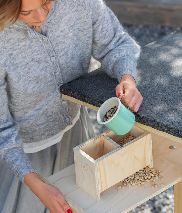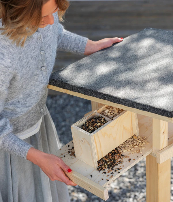 Im Inneren des Häuschens trennt eine Wand den Trog ab, sodass Sie diesen mit unterschiedlichen Futtersorten ausstatten können. Auf diese Weise gewährleisten Sie, dass jeder Vogel seine Lieblingsspeise findet. Damit Sie in der Lage sind, den Behälter problemlos zu reinigen und einfach mit Futter zu befüllen, lässt sich die Schublade praktisch herausziehen. Produziert wird das Vogelhäuschen durch die kompetenten Mitarbeiter der bayerischen Werkstätten für Menschen mit Behinderung der Stiftung Sankt Johannes. Die gemeinnützige Organisation setzt sich dafür ein, dass Menschen mit Einschränkungen eigenständig und erfüllt leben können. Wenn Sie zu diesem Ziel beitragen und Vögel in Ihren Garten locken wollen, dann bestellen Sie jetzt und lassen Sie sich das Futterhaus Karwendel inkl. Ständer von Dehner Natura liefern!