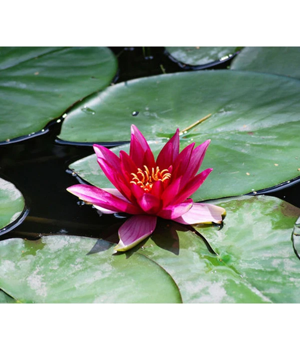 Diese relativ junge und bisher nur wenig bekannte Seerosenzüchtung ist eine außergewöhnliche Erscheinung. Von weitem sticht dem Betrachter vor allen die intensiv rosarote Blütenfarbe ins Auge, die vor dem dunklen Teichwasser besonders strahlend leuchtet. Tritt man dann näher, entdeckt man, dass die schmalen, spitz zulaufenden Blütenblätter der Seerose ‘Red Spider‘ einen interessanten Knitter-Look zeigen, so als seien sie aus Krepppapier gebastelt. Und jeder Seerosenkenner weiß, dass solche faszinierenden Effekte bei winterharten Seerosen extrem selten sind. Aber damit nicht genug. Hat man sich nach einer Weile an den prächtigen Blüten satt gesehen, wird man bemerken, dass auch die Blätter alles andere als alltäglich sind. Vielmehr präsentieren sie sich dekorativ gemustert, was den Zierwert der Seerose ‘Red Spider‘ noch erhöht.