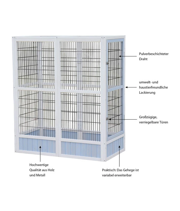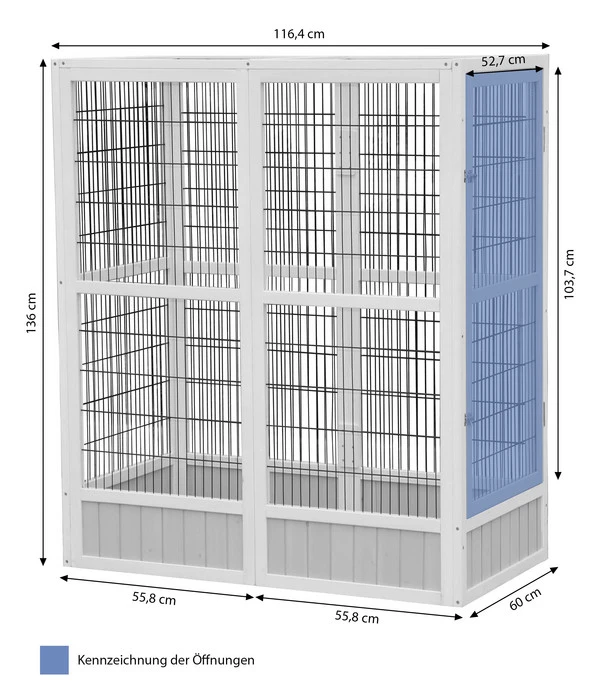 Das Dehner Vogelgehege Santorini hat einen stabilen Rahmen aus Holz, mit einer Stärke von 34/24 mm und einer Außenplatte von 8 mm. Das Metallgitter hat einen Gitterabstand von ca. 15 mm, wie es ideal ist für Kanarienvögel, Wellensittiche und andere Exoten. Die Holzelemente sind in der hübschen Farbkombi Hellblau/Weiß gestrichen, die dem Gehege eine sommerliche Ausstrahlung verleiht. Natürlich können Sie sicher sein, dass als Farbe eine tier- und umweltfreundliche Lackierung gewählt wurde. Das Gitter besteht aus Draht, der mit einer Pulverbeschichtung vor Witterungseinflüssen geschützt wurde.