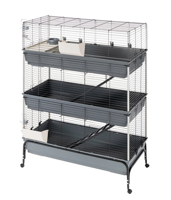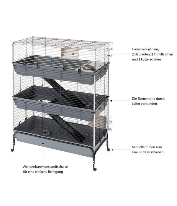 Sie möchten einem kleinen Mitbewohner Unterschlupf gewähren, vielleicht, um Ihren Kindern den verantwortungsvollen Umgang mit Tieren näher zu bringen? Dann erhalten mit dem dreistöckigen und mit großen Schalen aus Hartplastik ausgestatteten ferplast Nagerheim Rabbit 120 Tris das perfekte Basis-Paket für den Start einer Nagerhaltung. Nutzen Sie den mit Schiebetüren und vollständig aufklappbaren Türen ausgestatteten Käfig innerhalb eines Freigeheges als Rückzugsort oder als Nachtquartier für Ihre Kleintiere. Ganz egal, ob Sie sich für Kaninchen oder Meerschweinchen entscheiden – dank dieses Nagerheims genießen Ihre flauschigen Mitbewohner Ruhe und Komfort.