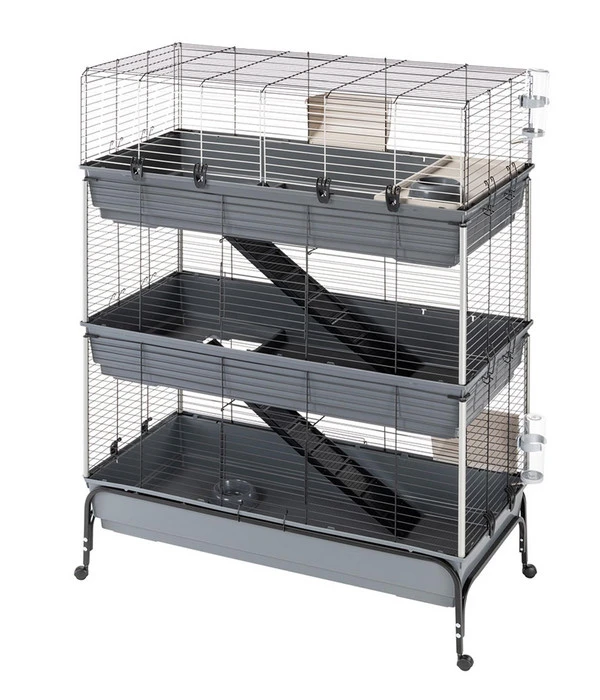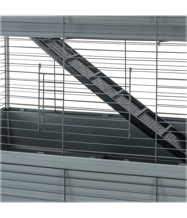 Als Halter profitieren Sie ebenfalls von den Vorzügen dieses modernen Nagerheims, denn die Reinigung gestaltet sich dank der durch Haken trennbaren Böden und Gitter kinderleicht. Auch die Sicherheit Ihrer Tiere ist selbstverständlich gewährleistet. Die einzelnen Ebenen sind durch Leitern sowie Seitensäulen verbunden und mit speziellen Verschlussklammern gesichert, sodass Sie sich um die Stabilität der Konstruktion keine Sorgen machen müssen. Die Lieferung Ihres ferplast Nagerheims Rabbit 120 Tris erfolgt inklusive umfangreichem Zubehör wie Heuraufen, Trinkflaschen und vielem mehr. Greifen Sie jetzt zu und freuen Sie sich auf zufriedene Nager!