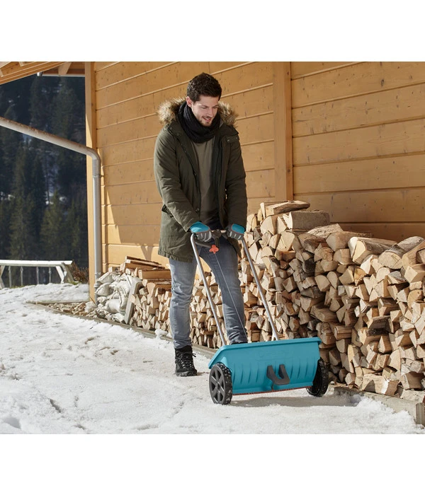 Wenn Sie das nächste Mal Dünger, Samen, Sand, Streusalz oder Granulat verteilen möchten, müssen Sie dieses nicht mehr mühsam selbst erledigen, sondern greifen stattdessen zum GARDENA Streuwagen L. Füllen Sie seinen Behälter mit dem entsprechenden Streugut, stellen Sie am Griff die gewünschte Streumenge ein und begeben sich mit dem Streuwagen zum Einsatzort. Dort betätigen Sie die Auf- und Zufunktion und fahren den Wagen über das gewünschte Areal. Die integrierte Streuwalze sorgt für eine gleichmäßige Verteilung und die dichte Gummilippe verhindert unerwünschtes Nachrieseln. Tipp: Nach der Nutzung lässt sich der Streuwagen L von GARDENA einfach mit Wasser reinigen.