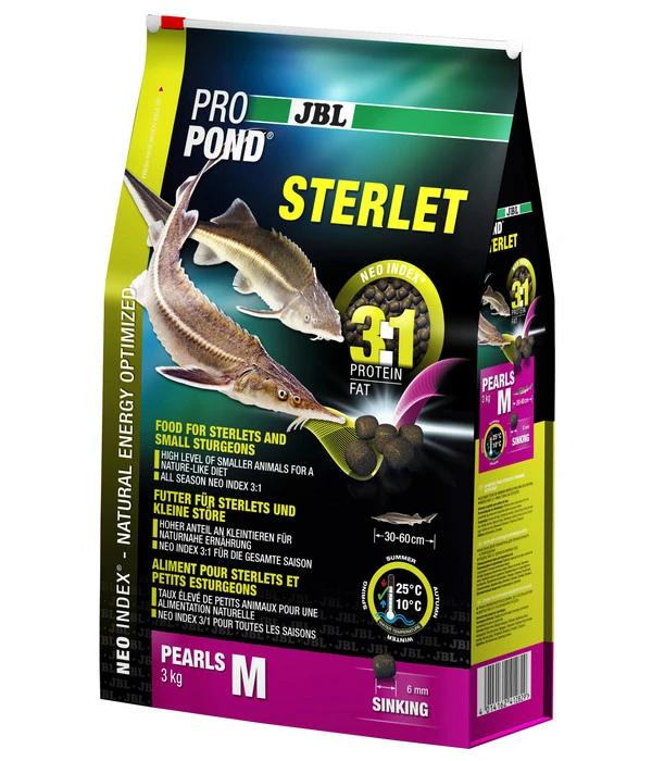 Das JBL ProPond Sterlet Teichfischfutter ist so beschaffen, dass es nach dem Absinken schnell verzehrt werden kann. Das wertige Fischfutter besitzt ein Protein-Fett-Verhältnis von 3:1, berechnet nach dem NEO-Index. Der NEO-Index wurde konzipiert, um den unterschiedlichen Teichfischarten mit ihren verschiedenen Größen und den Jahreszeiten mit wechselnden Umgebungsparametern gerecht zu werden. Für Störe dürfen es mehr Proteine und weniger Fette sein. Umgesetzt wird das durch einen Hauptanteil an Garnelen, Tintenfisch, Spirulina und Gammarus im JBL ProPond Sterlet S Fischfutter. Diese Inhaltsstoffe finden sich bei einer Wassertemperatur von 10 bis 25 °C auch in den natürlichen Lebensräumen der Störe.