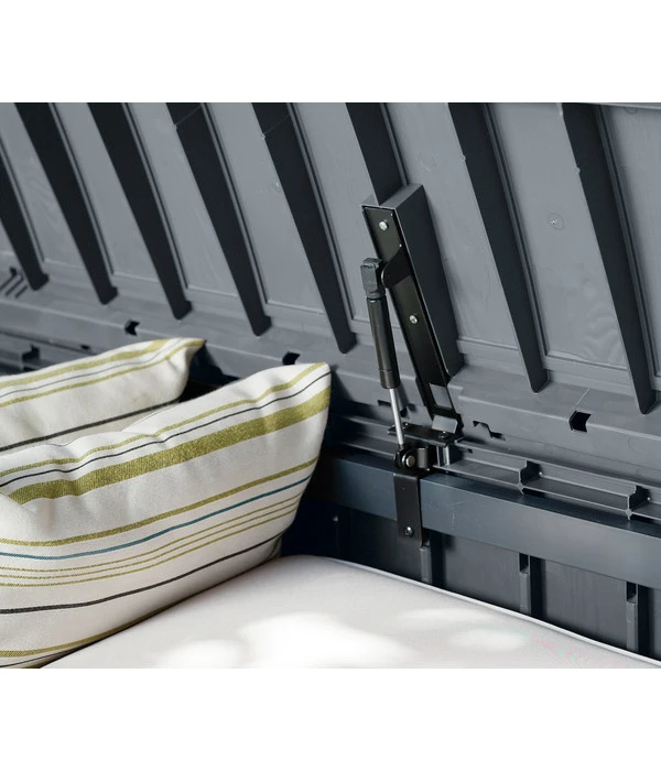 Die Keter Aufbewahrungsbox Glenwood mit einem Fassungsvermögen von 390 Litern ist aus hochwertigem Polypropylen gefertigt. Durch die eingesetzten Metallstreben ist sie besonders stabil. Der Deckel lässt sich dank der Gasdruckfeder in der Mitte bequem öffnen. Die Keter Aufbewahrungsbox Glenwood mit 390 Litern Volumen ist abschließbar, wobei das Schloss nicht im Lieferumfang enthalten ist. Der Deckel selbst kann bis zu 240 kg belastet werden und hat ein maximales Ladegewicht von ca. 50 kg.