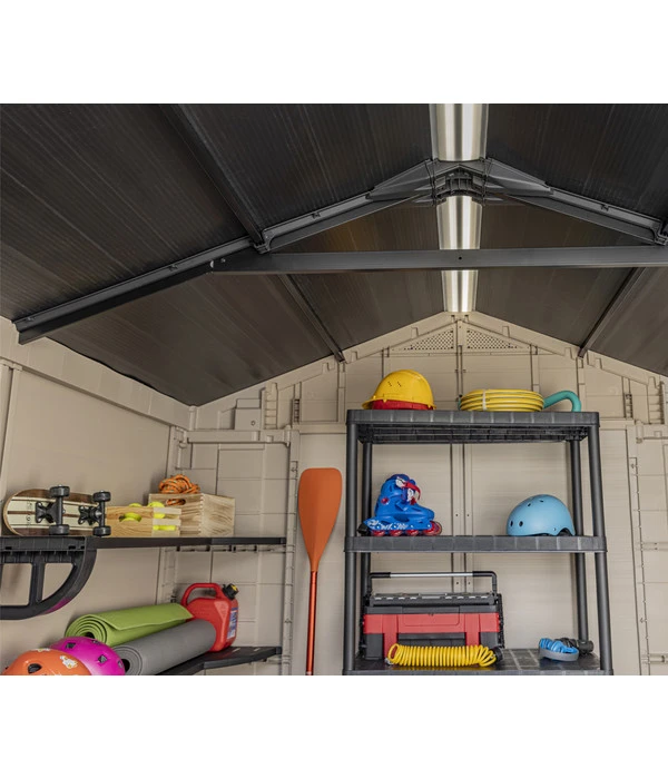Durch das Oberlicht ist für gute Lichtverhältnisse ohne Strom gesorgt, sodass Sie auch bei Schlechtwetter in Ihrem Gerätehaus heimwerken können. Dank der Entlüftung im Giebel müssen Sie sich um eine ausreichende Sauerstoffzufuhr keine Gedanken machen. Das Keter Kunststoffgerätehaus Factor überzeugt durch seinen praktischen und zweckdienlichen Charakter und ist daher die ideale Lösung, wenn Sie auf der Suche nach wartungsarmen und komfortablen Stauraum sind.