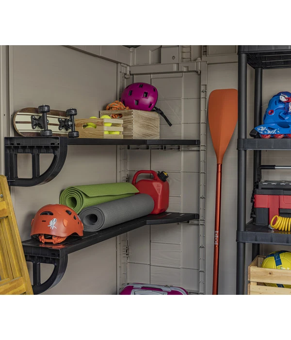 Mit dem Keter Kunststoffgerätehaus Factor verfügen Sie über ausreichend Platz für Ihr Hobby. Dank des pfiffigen Regalsystems bietet das Gerätehaus viel Stauraum. Auch große und sperrige Geräte finden in Ihrem Tepro Kunststoffgerätehaus Factor garantiert Platz, da es über eine praktische Doppeltüre verfügt, um Ihnen das Ein- und Ausräumen zu erleichtern. Egal ob Rasenmäher, Leiter oder Fahrrad – das Kunststoffgerätehaus Factor der Marke Keter schützt all Ihre Gartenutensilien. Die besonderen Eigenschaften des Materials machen das Häuschen zu einem wartungsarmen Objekt, welches Ihnen lange Zeit ohne weiteren Aufwand dienlich sein wird. Der Kunststoff zeichnet sich durch seine Wetter- und UV-Beständigkeit aus, wodurch Langlebigkeit garantiert ist. Lassen Sie Ihre Geräte nicht länger im Regen stehen und beginnen Sie mit der einfachen Montage Ihres Keter Kunststoffgerätehauses Factor.