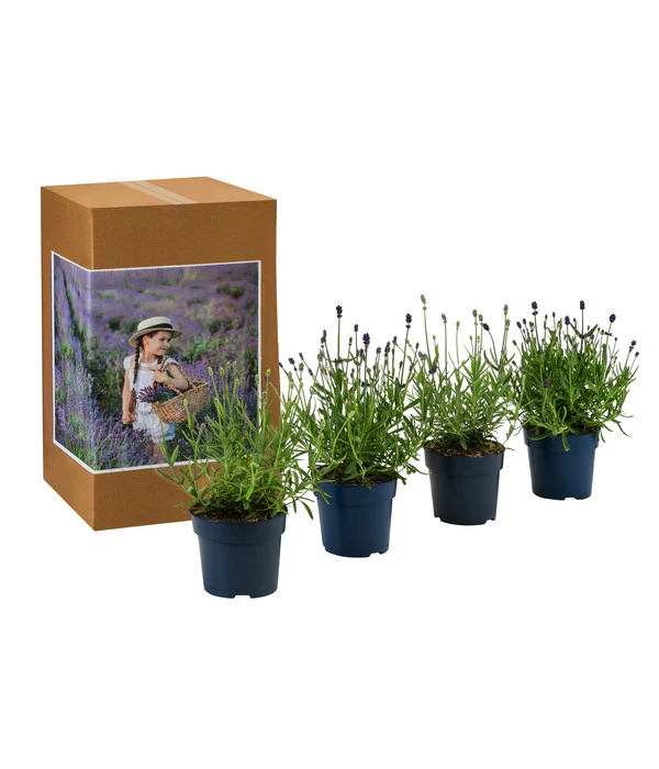 Vier verschiedene Sorten in einem Paket: ‚Felice‘, ‚Royal Blue‘, ‚Light Pink‘ und Dehners Bienenlavendel