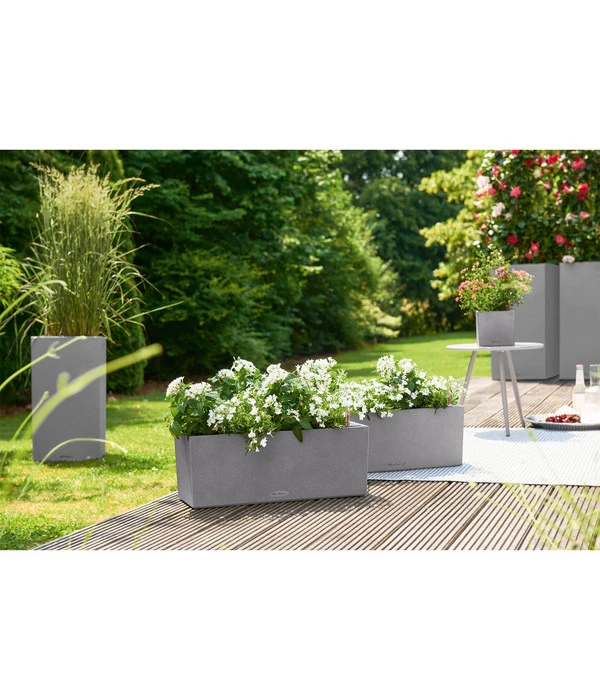 Tun Sie Ihren Blumen Gutes und versorgen Sie Ihre Pflanzen auch an heißen Tagen mit der optimalen Menge an Wasser. Das innovative LECHUZA-Bewässerungssystem mit integriertem Wasserreservoir lässt dabei keine Wünsche offen und übernimmt diese Aufgabe für Sie. So bleibt mehr Zeit für Erholung und Entspannung auf Ihrem Balkon. Zusätzlich dazu schnüren die herausnehmbaren Pflanzeneinsätze mit patentierten, versenkbaren Haltegriffen des Balconera Stone ein hervorragendes Paket für schnelles und bequemes Bepflanzen. Bei starkem Gewitter oder Winterbedingungen lassen Sie durch das schnelle Herausnehmen und Einlagern der Einsätze Ihre Lieblinge buchstäblich nicht im Regen stehen. Werden Sie aktiv und schaffen Sie sich das BALCONERA Stone Set an, um Ihren Balkon nach Ihren Wünschen zu gestalten.
