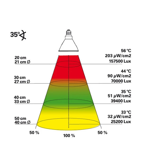 Die Lucky Reptile Bright Sun UV Jungle wurde so entwickelt damit sie den Bedingungen im natürlichen Habitat und der Lebensweise der Tiere Tribut zu zollen. Tropische Reptilien leben im Dschungel somit wird einiges an UV-Licht durch die Blätter und Zweige im Regenwald gefiltert und die Tiere bekommen nicht die voll Intensität der Sonne zu spüren. Mit der Lucky Reptile Bright Sun UV Jungle bekommen Sie denselben Effekt, da die Lampe weniger UV-Licht abgibt als herkömmliche Metalldampflampen. Sie sollten beachten, dass kletternde und baumbewohnende Tiere oft sehr nah an die Lampen herankommen. Da UV-Strahlung generell ein Gefahrenpotential haben und die UV-Intensität bei 10 cm Abstand 5-mal so hoch wie bei 30 cm Abstand ist, wurde der UV-Anteil bei der Lucky Reptile Bright Sun UV Jungle bewusst reduziert. Natürlich wurde das Spektrum der Lucky Reptile Bright Sun UV Jungle an die natürlichen Bedingungen in Waldregionen angepasst. Die Farbtemperatur beträgt 4000K und ist somit deutlich wärmer als das Tageslicht der Bright Sun UV Desert. Verschiedene Tests bestätigen, dass tropische Echsen, wie beispielsweise Wasseragamen, unabhängig vom UV-Anteil das wärmere Licht der Lucky Reptile Bright Sun UV Jungle dem Tageslicht der Lucky Reptile Bright Sun UV Desert vorziehen. Ein weiterer Vorteil der Metalldampflampe Lucky Reptile Bright Sun UV Jungle ist dass das wärmere Licht die grünen Farben der Pflanzen besser hervor bringt, somit ist Ihr Terrarium ein echter Blickfang. Die Terrarienlampe ist so konzipiert, dass die Wärme im direkten Strahlbereich des Lichts gebündelt wird. Somit wird die Wärme direkt nach unten gerichtet und geht bei der Lucky Reptile Bright Sun UV Jungle nicht nach oben oder zu den Seiten verloren, so wie es bei den meisten UV-Strahlern der Fall ist.