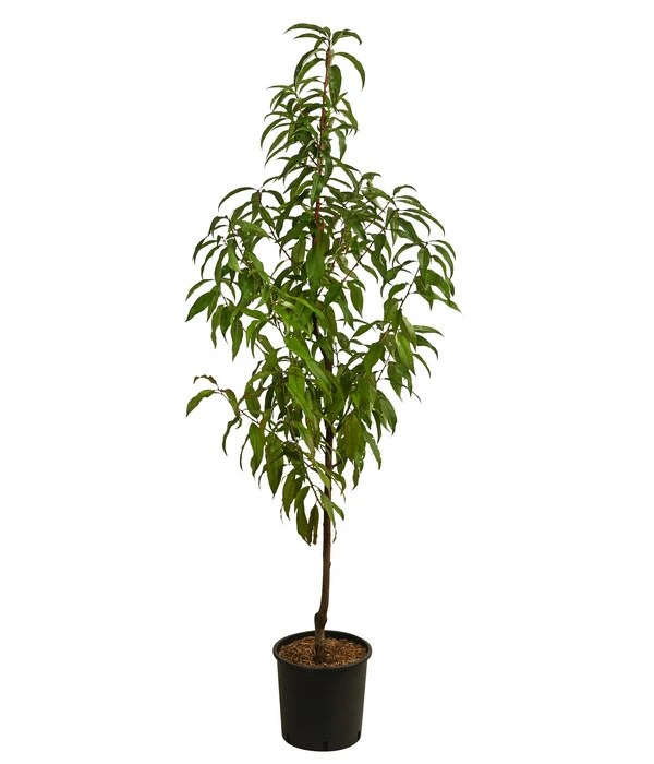 Die Sorte ‚Suncrest‘ strahlt mit der Sonne um die Wette, denn die Früchte leuchten in einem Goldgelb zwischen dem grünen Laub hervor. Die Pfirsiche sind groß und haben eine feste Schale, die aber beim Verzehr nicht stört. Süß und aromatisch – so lässt sich der Geschmack der saftigen Früchte beschreiben. Überzeugen Sie sich doch selbst von diesen besonderen, gelbfleischigen Pfirsichen. Normal sagt man, dass gelbfleischige Pfirsiche empfindlicher als weißfleischige sind, dafür aber besser im Geschmack. Doch nicht so bei ‚Suncrest‘. Die Sorte ist sehr robust gegen die Kräuselkrankheit sowie gegen Monilia. Was spricht noch gegen einen Pfirsichbaum in eigenen Hausgarten?