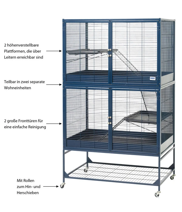 Füttern, streicheln, pflegen, reinigen…alle Ihre Haustiere brauchen Zuwendung und Pflege. Wie schön, dass Ihr SAVIC Nagerheim Suite Royal 95 Double perfekt durchdacht ist! An jeder Etage befinden sich zwei große Türen, durch die Sie mühelos an jede Stelle im Käfig kommen. Die Schutzkanten an den Platten halten Stroh, Streu und Futter im Käfig und damit Ihre Wohnung sauber. Übrigens: Die Plattformen lassen sich zur Reinigung einfach herausnehmen. Das ist wirklich praktisch!