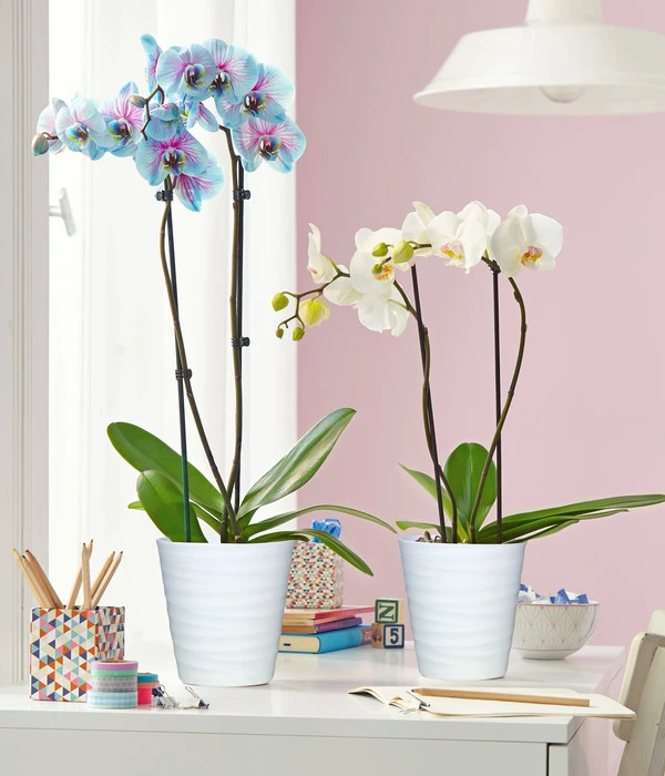 Sie gehören ohne Zweifel zu den beliebtesten Pflanzen auf unserer Fensterbank: die Phalaenopsis. Anmutig schweben die zahlreichen Blüten, wie Schmetterlinge über der Blattbasis der Pflanze. Dabei ist sie überaus blühfreudig und robust, da die Pflanzen selbst bei wenig Pflege über mehrere Monate hinweg blühen. Gerade deshalb eignen sie sich auch hervorragend für ungeübte Orchideenfreunde. Mit der Schmetterlingsorchidee ‚Blue Wonder‘ erleben Sie ein (blaues) Wunder der besonderen Art: Die Blüten dieser ursprünglich weißen Orchidee wurden durch ein spezielles Verfahren gefärbt: Himmelblau mit pinker Aderung. Eine einzigartige Besonderheit und ein echter Eyecatcher auf jeder Fensterbank! Erst die Nachblüten neuer Blütenrispen erstrahlen dann wieder in reinem Weiß.