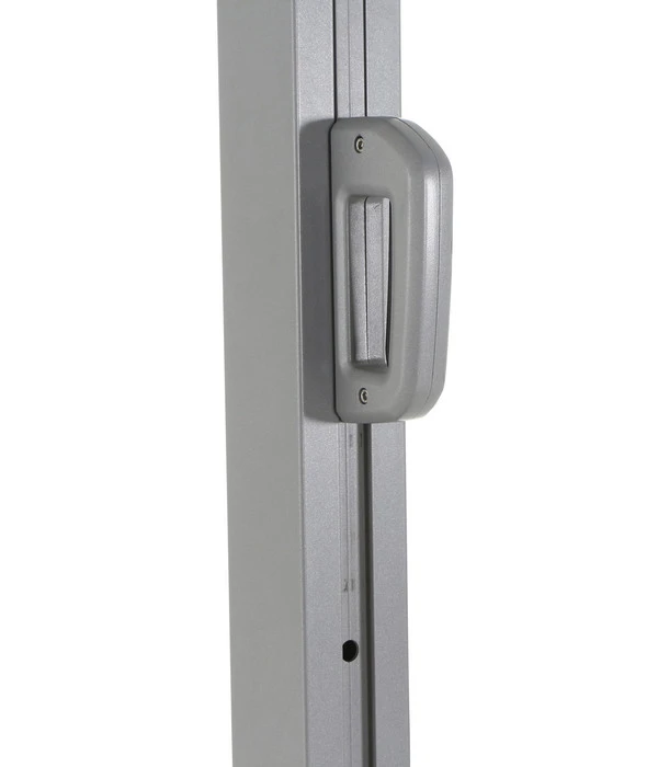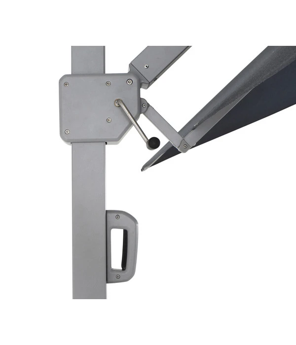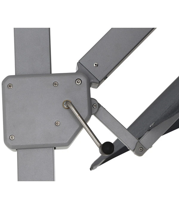 So können Sie den Schirm mit Hilfe des Fußpedals um 360° drehen; Sie können die Schirmfläche aber auch mit einem Schiebegriff in 6 Positionen vertikal kippen, wenn die Sonne tiefer steht. Sein volles Schattenpotenzial entwickelt er, indem Sie ihn ganz einfach mit einer Kurbel aufspannen. An dieser Aufzählung – Fußpedal, Schiebegriff und Kurbel – können Sie ebenfalls erkennen, dass das Handling des Ampelschirms leicht und ohne Kraftaufwand möglich ist. Und die Materialwahl verspricht Freude für viele Jahre. Denn das Gestell und die Streben sind aus hochwertigem, pulverbeschichtetem Aluminium, die Strebenenden sind sogar verschraubt. Der Bezug besteht aus einer festen Polyester-Qualität mit 240g/m² und kann bei Bedarf gewaschen werden.