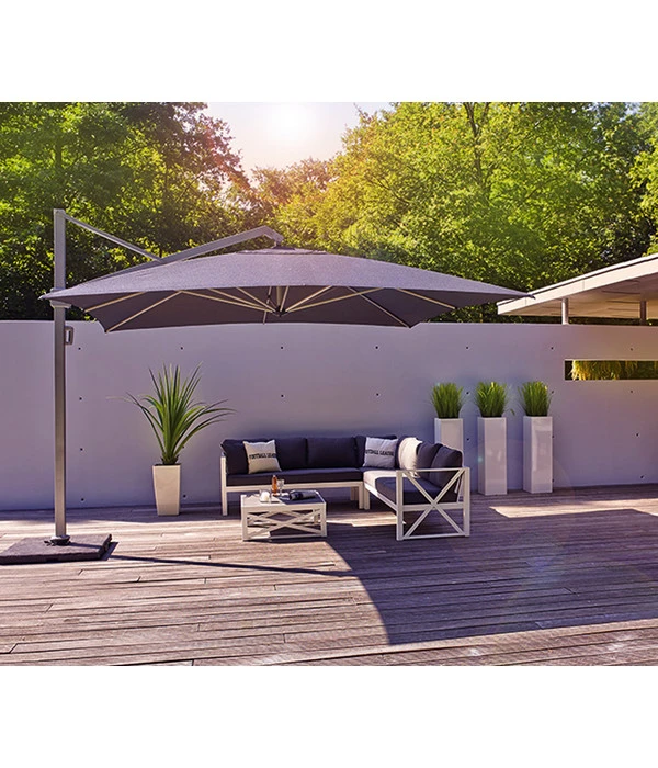 Mit seinem rechteckigen Format in Kombination mit einer hochwertigen Materialqualität erweist sich der Siena Garden Ampelschirm Stratos als ein echter Profi in Sachen Sonnenschutz. Deshalb werden Sie ab jetzt auch an heißen Sommertagen auf der Terrasse bleiben und nicht ins Haus flüchten, denn der Sonnenschirm beschattet großzügig Ihre gesamte Sitzgruppe. Und Sie wissen auch, dass er mit seinem UV-Schutz 50+ außerdem die gefährlichen UV-Strahlen hervorragend filtert. Außerdem punktet er mit einem modern schlichten Design, das sich perfekt zu allen Gartenmöbelstilen und Material-Qualitäten kombinieren lässt. Gönnen Sie sich und Ihrer Familie einen hochwertigen Sonnenschutz: den Siena Garden Ampelschirm Stratos!