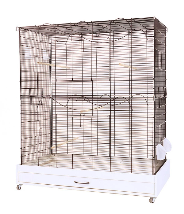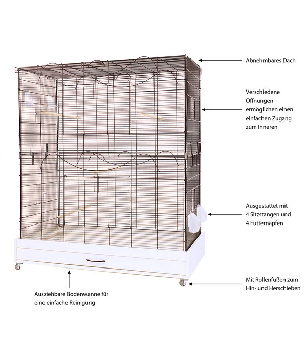 Der Vogelkäfig Yasmine zeichnet sich durch eine besonders angenehme Handhabung aus. Zwei große Klappen vorne und zwei Türen bieten einen einfachen Zugang. Sehr praktisch: auch das Dach lässt sich bei Bedarf vollständig abnehmen. Damit das Reinigen nicht zu einer zu anstrengenden Aufgabe wird, ist der Vogelkäfig Yasmine mit einer ausziehbaren Bodenwanne versehen. Vier Gummirollen ermöglichen zudem ein komfortables Bewegen des Käfigs. Darüber hinaus ist die Voliere sehr wertig verarbeitet, sodass Sie viele Jahre im Einsatz bleiben kann. Bestellen Sie jetzt diesen Vogelkäfig und schaffen Sie ein tolles Heim für Ihre Vögel!