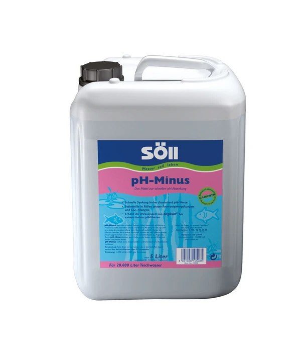 Wenn Sie einen Gartenteich besitzen benötigt dieser viel Pflege und Zeit. Vor allem aber der pH-Wert sollte jederzeit optimale angepasst sein. Wenn dieser jedoch zu hoch ist, sollten Sie schnell mit dem Söll pH-Minus handeln. Das Söll pH-Minus dient der schnellen Senkung zu hoher basischer pH-Werte. Durch das Söll pH-Minus wird nicht nur der Wert gesenkt sondern es werden auch akute Ammoniakvergiftungen der Teichfische sofort bekämpft und der CO2-Mangel der Pflanzen wird behoben. Zudem können die gelösten Nährstoffe des Söll pH-Minus von den Teichpflanzen besser aufgenommen werden was wiederrum zu einem besseren Pflanzenwuchs führt. Zudem können Ihre Teichfische durch die Behandlung mit Söll pH-Minus wieder besser Atmen, was das Wohlbefinden steigert und dadurch eine höhere Nahrungsaufnahme zur Folge hat. Natürlich enthält das Söll pH-Minus keinerlei Komplexbildner und hinterlässt keine Rückstände im Wasser. So sorgen Sie für einen optimalen Lebensraum für Fische und Pflanzen.