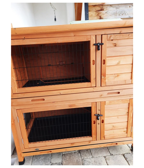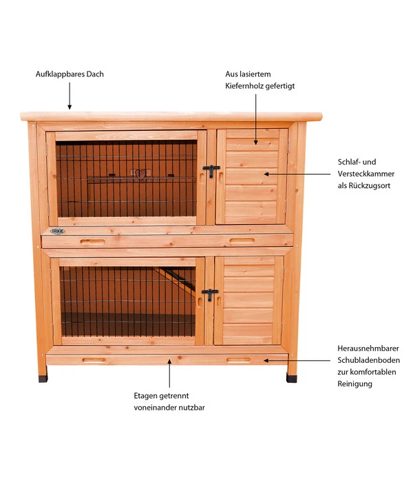 Für Kaninchen, die im Freien gehalten werden, ist das Nagerheim Natura VII von Trixie die ideale Lösung. Die lasierten Kiefernholzwände halten der Witterung stand und schützen die Tiere. Der Kaninchenstall eignet sich zur Zusammen- oder Einzelhaltung, da er aus zwei Ebenen besteht, die sich mit einer Rampe verbinden lassen. Ein weiterer Vorteil sind die herausnehmbaren Schubladenböden mit fest installierten Kunststoffwannen, dank derer sich der Kaninchenstall komfortabel reinigen lässt.