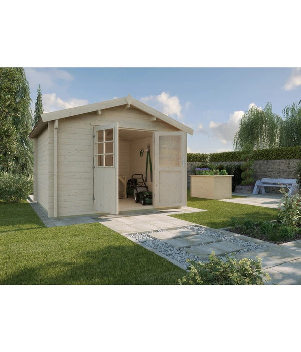 Das Weka Gartenhaus in stabiler Blockbohlenbauweise ist vielseitig verwendbar und kann aufgrund seines großen Raumvolumens sowohl als Gerätehaus als auch als Raum zum Entspannen und Feiern genutzt werden. Durch eine Firsthöhe von 251 Zentimeter und eine Seitenwandhöhe von 210 Zentimeter wird das Gartenhaus zu einem echten Raumwunder. Dank einer Durchgangsbreite von 165 Zentimeter können auch problemlos größere Gegenstände untergebracht werden. Die 38 Millimeter Blockbohlen mit eingebauter Nut und Feder sorgen an den Wänden für optimalen Halt und eine sehr gute Stabilität. Das Gartenhaus ist zudem winddicht und verfügt über eine Doppeltür aus Echtglas. Das Dach hat eine Massivholz-Stärke von 16 mm und hat vorne sowie seitlich einen Dachüberstand von 20 cm und hinten 10 cm.