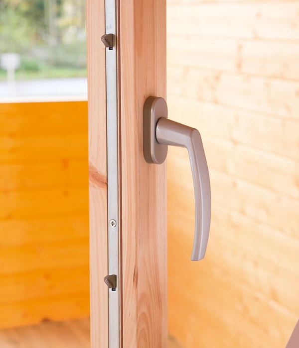 Durch die insgesamt sechs bodentiefen Fenster fällt viel Licht in den Innenraum des Wolff Finnhaus Gartenhaus Katrin 44-B. Außerdem sind alle Fensterelemente aus echtem Glas, wodurch vorzeitiges Verkratzen verhindert wird. Die Fenster in den Wänden haben einen Einhand-Dreh-/Kippmechanismus, so dass Sie den Innenraum gut lüften können. Die großzügige Doppeltür besteht aus hochwertigem Leimholz, sodass sie sich nicht verziehen wird und immer beste Funktionalität garantiert ist. Sie erhalten die Tür komplett mit Drückergarnitur, Einsteckschloss und Profilzylinder.