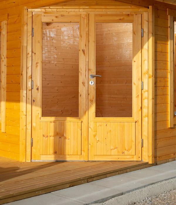 Das Wolff Finnhaus Gartenhaus Nina 28-B hat eine großzügige Doppeltür aus hochwertigem, nordischem Leimholz, so dass sich die Tür nicht verziehen wird und eine optimale Freigängigkeit für viele Jahre gewährleistet ist. Sie erhalten die Tür selbstverständlich komplett mit Drückergarnitur, Einsteckschloss und Profilzylinder. Bei dem Glas in der Ecktür sowie beim Fenster handelt es sich um Echtglas, sodass ein vorzeitiges Verkratzen verhindert wird und das Wolff Finnhaus Gartenhaus Nina 28-B lange seine edle Optik behält. Noch ein Hinweis: Die Terrasse kann wahlweise rechts oder links angebaut werden, wie es am besten zu Ihrer Gartensituation passt.