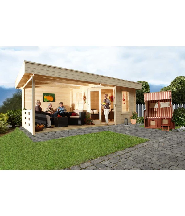 Lange haben Sie davon geträumt, jetzt steht es fix und fertig im Garten und wird den Freizeitwert Ihrer grünen Oase nochmals steigern: das Wolff Finnhaus Gartenhaus Nina 28-B. Mit dem vielen Holz, dem lichtdurchfluteten Innenraum und der großzügigen, überdachten Terrasse lädt es zu den verschiedensten Freizeitvergnügen ein. Für entspannte Wochenenden solo oder mit der Familie und natürlich auch, um mit guten Freunden rauschende Gartenfest zu feiern. Feste, von denen alle noch lange reden werden, denn die besondere Atmosphäre, die in und an Ihrem neuen Gartenhaus herrscht, hinterlässt bei allen einen tiefen Eindruck. Haben Sie einen passenden Platz für dieses hochwertige Blockbohlenhaus mit insgesamt 16 m² Grundfläche? Dann warten Sie nicht länger und bestellen gleich das Wolff Finnhaus Gartenhaus Nina 28-B!